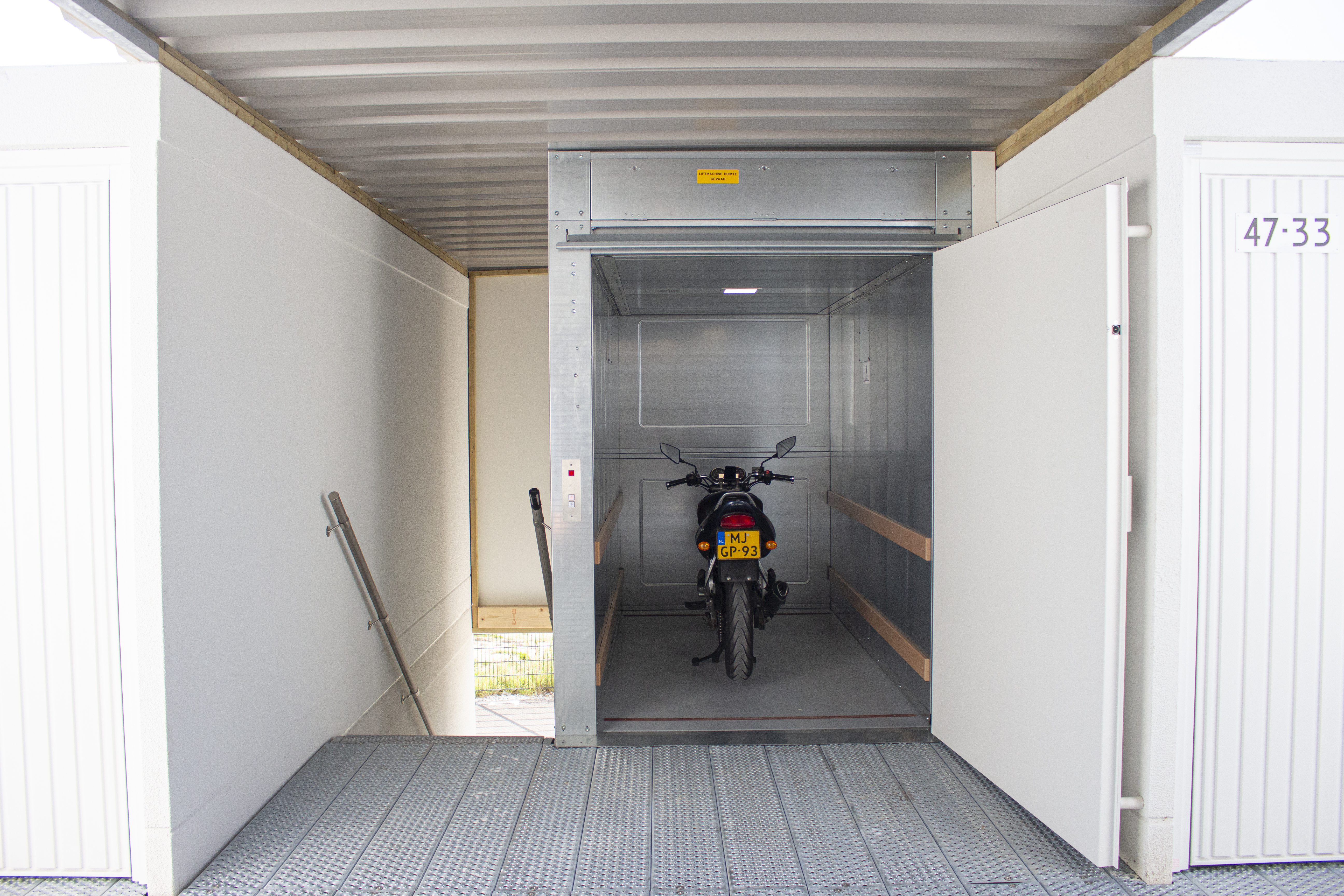 Doordat de Medium garagebox zich op de eerste verdieping bevind kunt u deze alleen via de trap of met de goederen lift bereiken. Wilt u weten hoe dat werkt? In de video hiernaast laten we het zien.